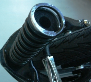 見ると、折りたたまれた前輪がきっちりとはまっておらず、スプリングが地面を削っていた。